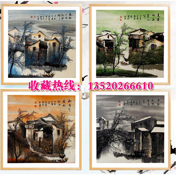 国画江南水乡四季图斗方画 马景新...